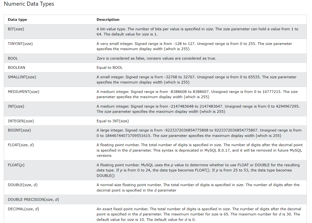 အခုအပေါ်မှာပြောခဲ့တာတွေကတော့ အသုံးပြုတာများတဲ့ data types တွေပဲဖြစ်ပါတယ်။ storage size တွေကိုတော့ ကျနော်လည်းအလွတ်မရပါဘူး၊ လိုအပ်တဲ့အချိန်မှသာသက်ဆိုင်ရာ documentation ကိုပြေးကြည့်လိုက်တာပဲ။ W3Schools မှာတော့ data types တွေကိုဒီလိုပိုမိုတိတိကျကျဖော်ပြထားပါတယ်။ Reference အနေနဲ့ထည့်သွင်းဖော်ပြပေးလိုက်ပါတယ်။ MySQL Data Types (Version 8.0) အတွက်ဖြစ်ပါတယ်။ (DBMS အလိုက်ပြောင်းလဲနိုင်တာကြောင့် အသုံးပြုတဲ့ DBMS နဲ့ version ကိုပူးတွဲဖော်ပြခြင်းဖြစ်ပါတယ်)