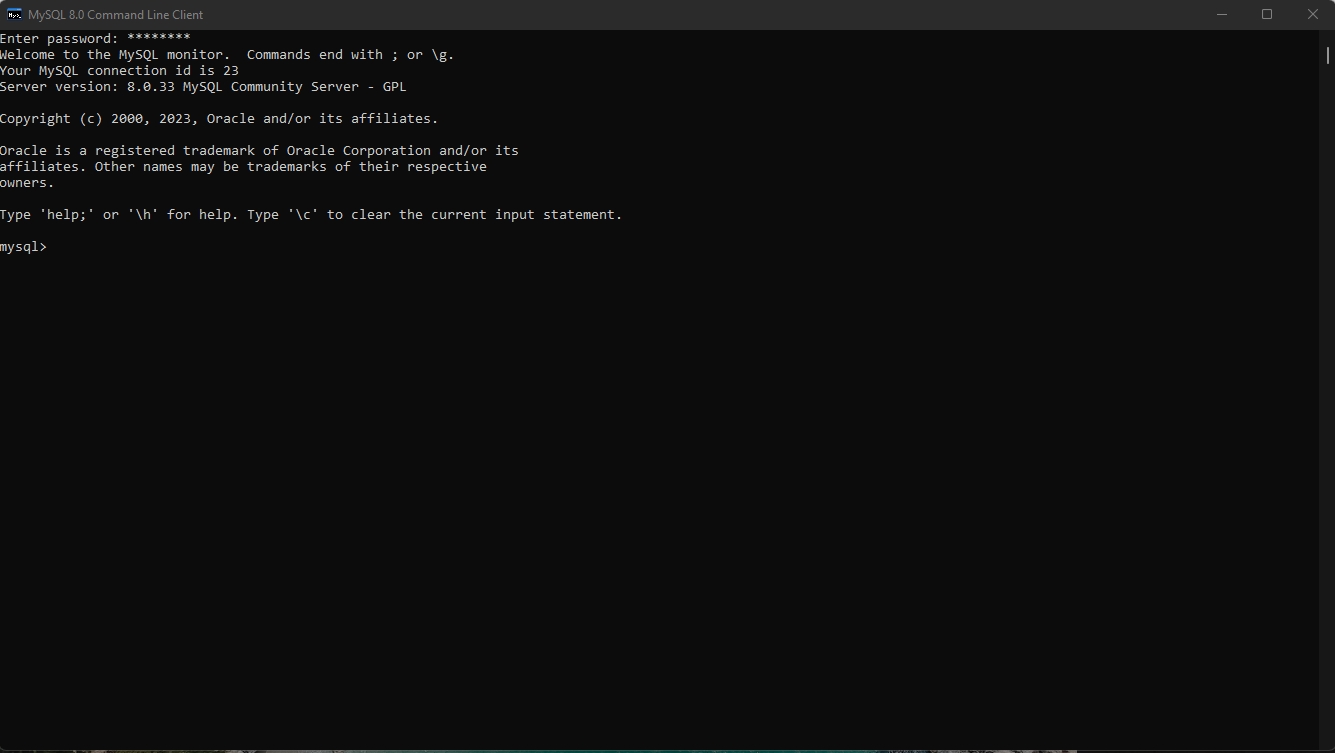 MySQL 8.0 command line client ကို window start menu ကနေတစ်ဆင့်ဖွင့်လိုက်ပါမယ်။ password ရိုက်ထည့်ပြီးရင်အသုံးပြုနိုင်ပါပြီ။
