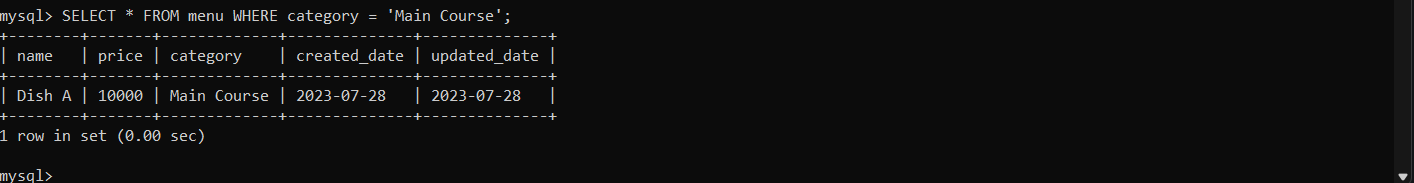 condition နေရာမှာ category က Main Course ပါဆိုတဲ့ category = 'Main Course' ကကိုအစားထိုးပေးလိုက်ပါမယ်ဆို Main Course ဖြစ်တဲ့ record တစ်ကြောင်းပဲထွက်လာတာကိုမြင်ရပါမယ်။