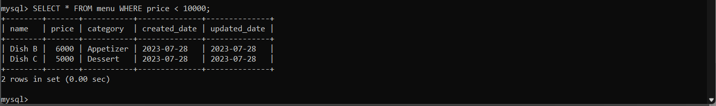 menu table ထဲကဈေး 10000 ထက်နည်းတဲ့ items တွေကိုဆွဲထုတ်ကြည့်ရအောင်။ < less than character ကိုအသုံးပြုပါမယ်။