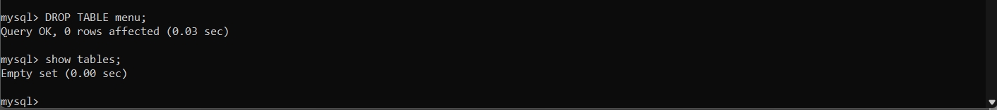 CREATE TABLE menu (name VARCHAR(100), price INTEGER(10), category VARCHAR(50), created_date DATE, updated_date DATE );show tables နဲ့ပြန်စစ်ကြည့်မယ်ဆို ဒီလိုမြင်ရပါလိမ့်မယ်။