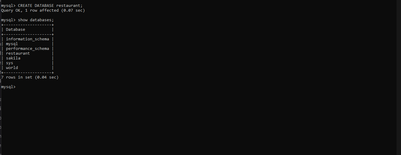 show databases ကိုသုံးပြီးပြန်စစ်ကြည့်မယ်ဆို restaurant db ကိုတွေ့ရပါမယ်။