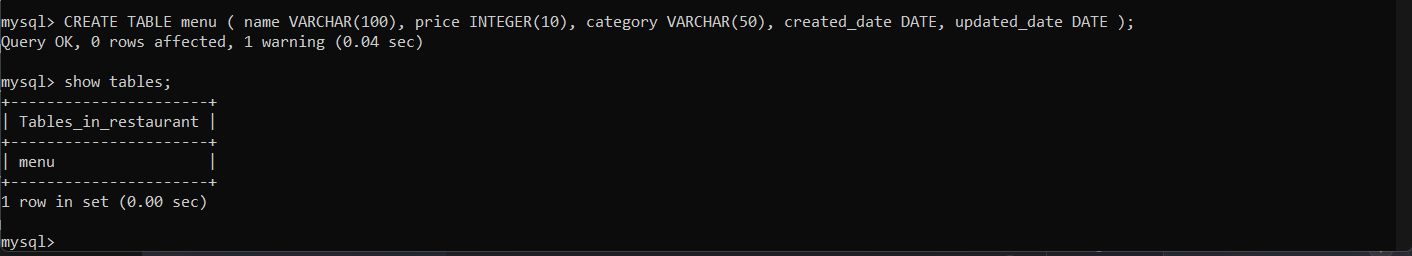 ဆိုင်မှာရနိုင်တဲ့ဟင်းပွဲတွေကိုသိမ်းဖို့အတွက် menu ဆိုတဲ့ table ဆောက်ပါမယ်။
