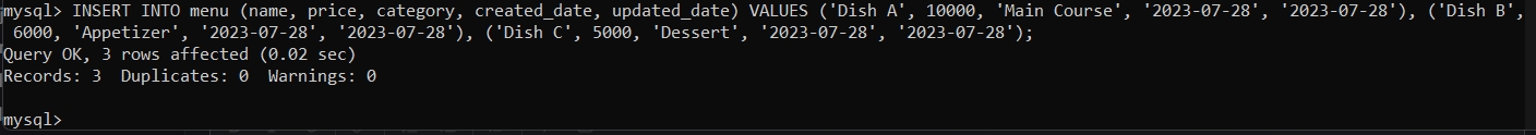 INSERT INTO menu (name, price, category, created_date, updated_date) VALUES ('Dish A', 10000, 'Main Course', '2023-07-28', '2023-07-28'), ('Dish B', 6000, 'Appetizer', '2023-07-28', '2023-07-28'), ('Dish C', 5000, 'Dessert', '2023-07-28', '2023-07-28');
