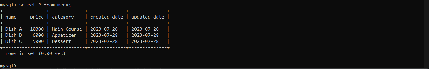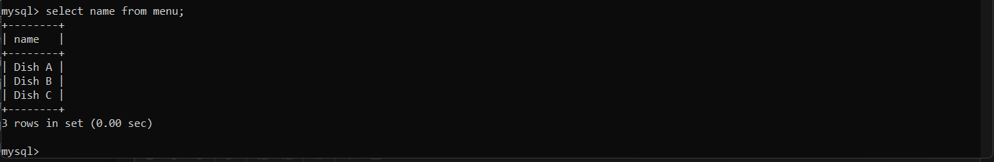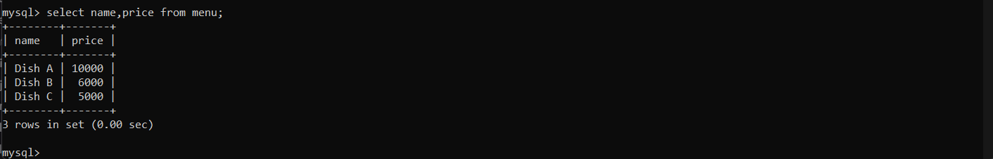 menu table ထဲမှာရှိတဲ့ data အားလုံးကိုပြပါလို့ဆိုလိုတာဖြစ်ပါတယ်။ SELECT နဲ့ FROM keyword ကိုအသုံးပြုပါတယ်။ * ကတော့အားလုံးကိုဆိုလိုခြင်းဖြစ်ပါတယ်။