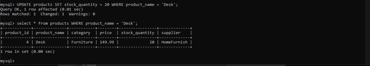 product_name က Desk ဖြစ်တဲ့ records တွေရဲ့ stock_quantity တန်ဖိုးကိုထပ်ပြီးပြင်ဆင်ကြည့်ပါမယ်။
