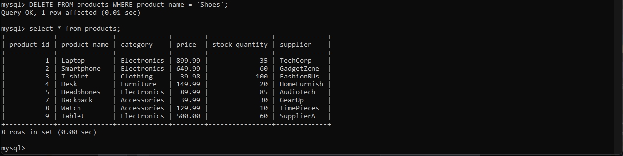 WHERE product_name = 'Shoes';ပျက်သွားလားဆိုတာကို select ပြန်ဆွဲပြီးကြည့်နိုင်ပါတယ်။ Delete ချတဲ့နေရာမှာ WHERE condition မလိုက်လို့လည်းရပါတယ်။ မလိုက်ဘူးဆိုရင်တော့ table ထဲမှာရှိတဲ့ data တွေအကုန်ပျက်သွားမှာဖြစ်ပါတယ်။