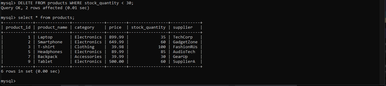 stock_quantity 30 အောက်ရောက်နေတဲ့ records တွေဖျက်ချင်တယ်ဆိုပါစို့။
