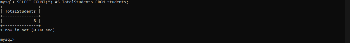 COUNT(*) ဆိုပြီး * ကိုသုံးပြီးတော့အားလုံးးရဲ့ results ကိုယူပါမယ်။ AS TotalStudents ဆိုတာကတော့ alias ပေးလိုက်တာဖြစ်ပါတယ်။ alias ဆိုတာကတော့အသုံးပြု (ပြန်ခေါ်လို့ရမယ့်)နာမည်တစ်ခုပေးလိုက်တာလို့ဆိုနိုင်ပါတယ်။ လောလောဆယ်သိပ်နားမလည်လည်းရပါတယ်။
