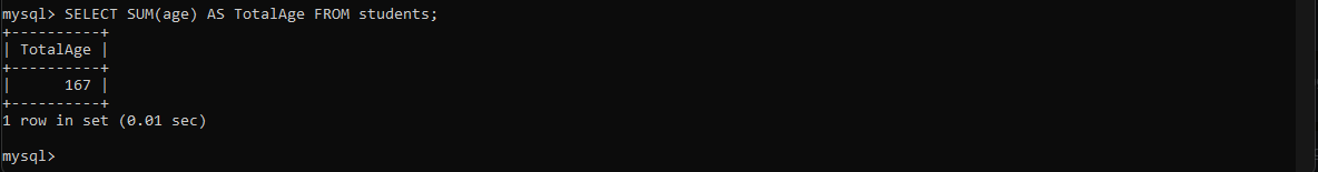 ကိန်းဂဏန်းတွေရှိတဲ့ column တွေရဲ့တန်ဖိုးတွေကိုစုပြီးပေါင်းချင်တဲ့အချိန်မှာ SUM ကိုသုံးနိုင်ပါတယ်။ ဥပမာ students table ထဲက age column တွေအကုန်ပေါင်းချင်တယ်ဆိုပါစို့၊ အောက်ကလိုမျိုး SUM ကိုသုံးပြီးရေးနိုင်ပါတယ်။