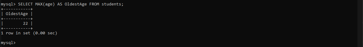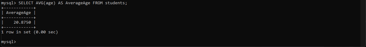 AVG ကတော့ SUMနဲ့ပုံစံတူပဲ၊ သို့ပေမယ့်ပေါင်းတာမဟုတ်ဘဲနဲ့ Average ကိုတွက်ပေးတာဖြစ်ပါတယ်။ students table ထဲက age column ရဲ့ average ကိုတွက်ကြည့်ရအောင်။ (ဥပမာဒီကျောင်းကကျောင်းသားတွေရဲ့ average age ကဘယ်လောက်လဲဆိုတာမျိုးတွက်တဲ့နေရာမျိုးမှာအသုံးဝင်ပါတယ်။)