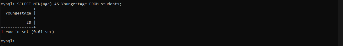 MIN ကတော့အသေးဆုံးကိန်းဂဏန်းကိုဆွဲထုတ်ချင်တဲ့အချိန်မျိုးမှာသုံးပါတယ်။ students table ထဲကအသက်အငယ်ဆုံးကျောင်းသားကိုသိချင်တယ်ဆိုရင် ဒီလိုမျိုးထုတ်ကြည့်နိုင်ပါတယ်။