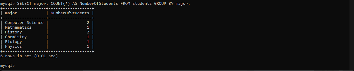GROUP BY ကိုအရှေ့မှာတွေ့ပြီးသားဖြစ်မှာပါ။ ထပ်ဖော်ပြရတဲ့အကြောင်းရင်းက Aggregation function တွေသုံးပြီး query ဆွဲတဲ့အချိန်မှာ GROUP BY ကိုသုံးပြီး group လေးတွေခွဲပြီး data တွေကိုထုတ်ကြည့်လို့ရပါတယ်။ ဥပမာ major တစ်ခုချင်းစီမှာကျောင်းသားဘယ်နှစ်ယောက်ရှိလဲဆိုတာမျိုးသိချင်ရင် GROUP BY ကို Aggregation function တွေနဲ့ပေါင်းပြီးအောက်ကလိုသုံးနိုင်ပါတယ်။