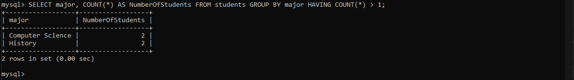 HAVING ကတော့ အရှေ့အပိုင်းတွေမှာဖော်ပြခဲ့တဲ့ WHERE နဲ့အတူတူပါပဲ။ Aggregation functions တွေမှာ WHERE ကိုအသုံးပြုလို့မရနိုင်တဲ့အတွက် HAVING ကိုသုံးခြင်းဖြစ်ပါတယ်။ အပေါ်က query ကိုပဲ HAVING နဲ့ filter ခံကြည့်ရအောင်။ major group ထဲကမှကျောင်းသားတစ်ယောက်အထက်ရှိတဲ့ major ကိုပဲလိုချင်တယ်ဆိုပါစို့။