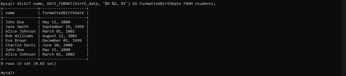 SELECT name, DATE_FORMAT(birth_date, '%M %d, %Y') AS FormattedBirthDate
