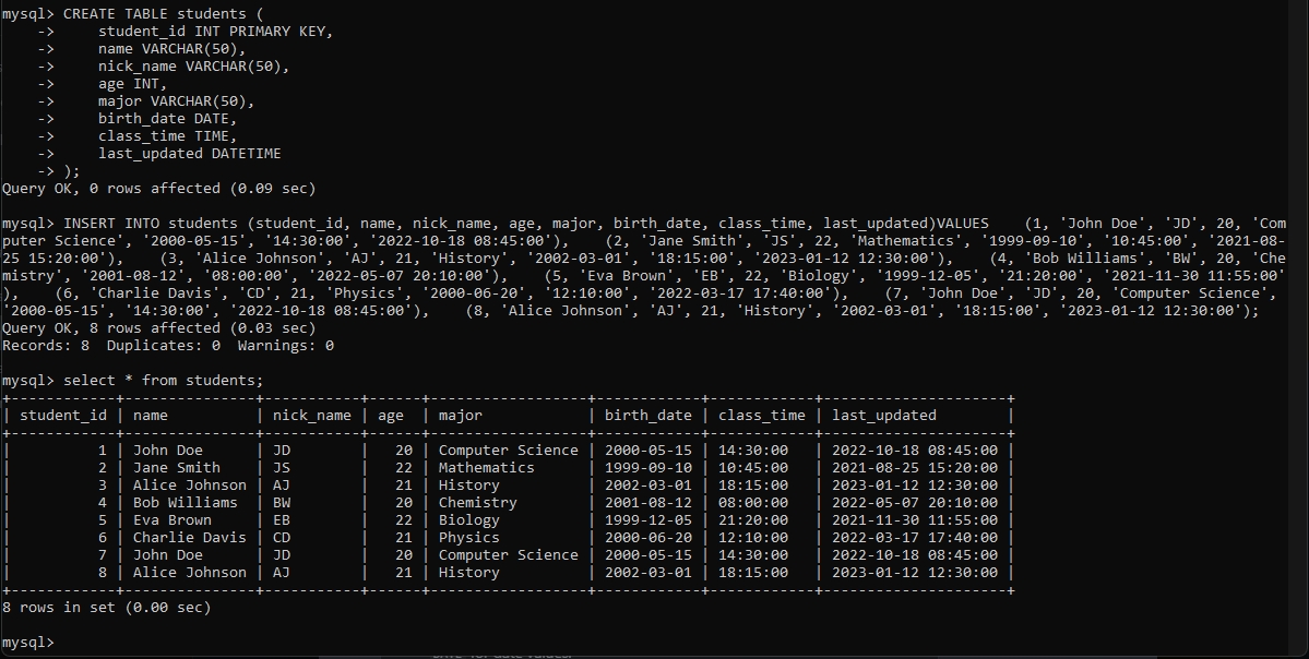 (1, 'John Doe', 'JD', 20, 'Computer Science', '2000-05-15', '14:30:00', '2022-10-18 08:45:00'),