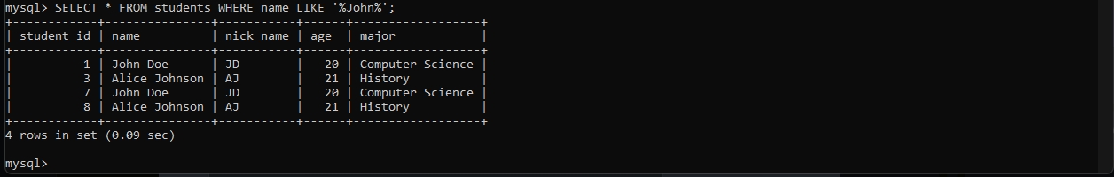 students table ထဲက name ဆိုတဲ့ column မှာ John ဆိုတဲ့စာသားပါတဲ့ data တွေကိုဆွဲထုတ်ချင်တယ်ဆိုပါစို့။