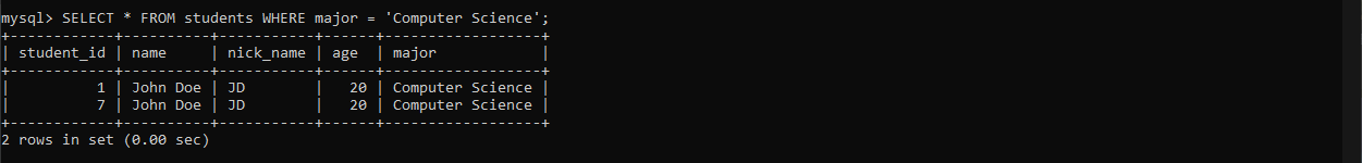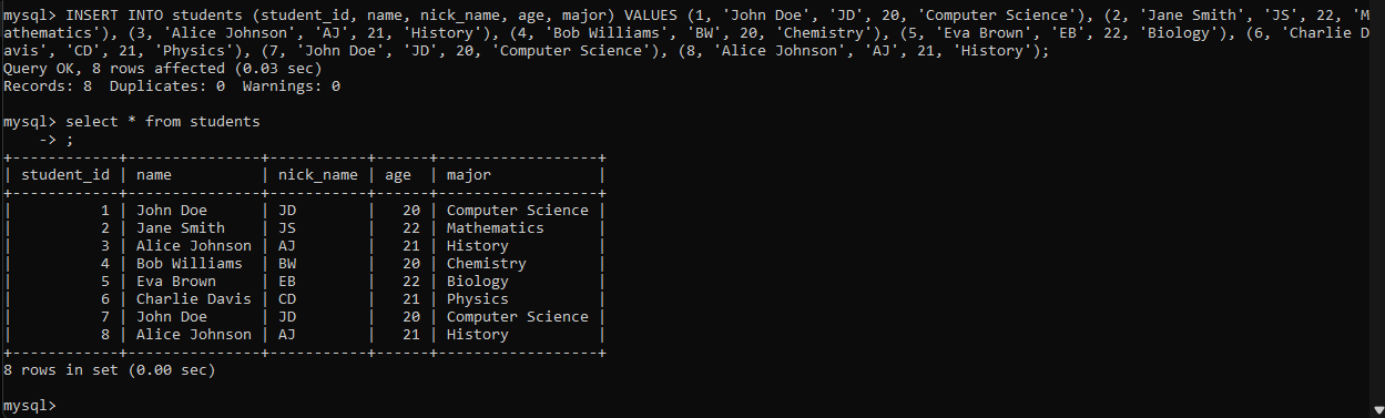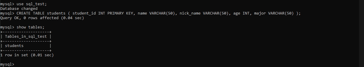 sql_test ဆိုတဲ့ database ထဲမှာ students table တစ်လုံးဆောက်ထားလိုက်ပြီး INSERT command နဲ့ data တစ်ချို့ထည့်သွင်းထားပါမယ်။ ဒီ students table ကိုအသုံးပြုပြီး sorting နဲ့ filtering လုပ်တဲ့ queries တွေစမ်းသပ်သွားပါမယ်။