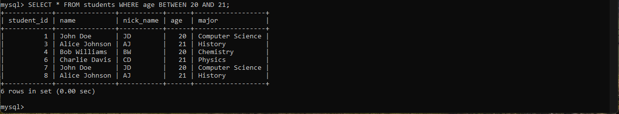Range condition တစ်ခုကြားထဲက data တွေကိုဆွဲထုတ်ချင်တဲ့အချိန်မှာသုံးပါတယ်။ ဥပမာ အသက် 20 နဲ့ 21 ကြားထဲကကျောင်းသားတွေကိုလိုချင်တယ်ဆိုပါစို့။