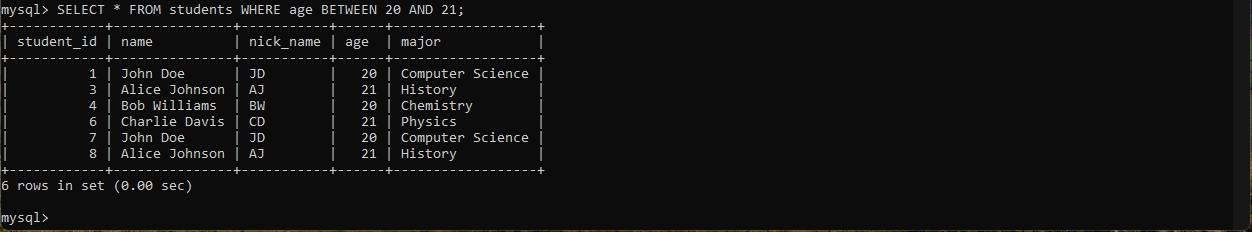 (8, 'Alice Johnson', 'AJ', 21, 'History');select * နဲ့ data တွေကိုပြန်စစ်ကြည့်နိုင်ပါတယ်။