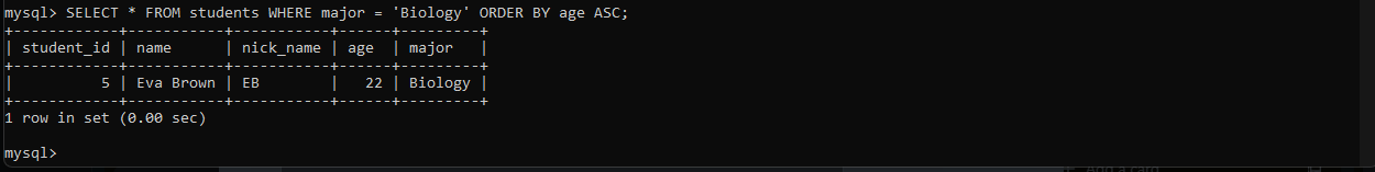 အထက်မှာဖော်ပြခဲ့တဲ့ sorting နဲ့ filter commands တွေကိုပေါင်းပြီးအသုံးပြုကြည့်ပါမယ်။ အသက်ကို ငယ်စဉ်ကြီးလိုက်နဲ့ Biology major ဖြစ်တဲ့ကျောင်းသားတွေကိုဆွဲထုတ်ကြည့်ပါမယ်။