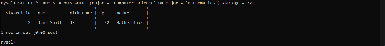 Table ထဲမှာ age 22 ဖြစ်တဲ့ကျောင်းသားကိုဆွဲမယ်၊ ပြီးတော့ကျောင်းသားက Computer Science သို့ Mathematics major ဖြစ်ရမယ်။ ဒီလိုမျိုး case မှာအောက်က query လိုမျိုး ( ) ရေးပေးခြင်းက conflict ဖြစ်နိုင်မယ့်အခြေအနေကိုကာကွယ်ပေးနိုင်ပါတယ်။