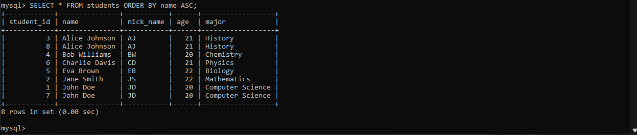 Sorting စီဖို့အတွက် SQL မှာတော့ ORDER BY ဆိုတဲ့ command ကိုအသုံးပြုပါတယ်။ လိုအပ်သလို ASC ascending, DESC descending options တွေကိုအသုံးပြုနိုင်ပါတယ်။ students table ထဲက name တွေကို ORDER BY command အသုံးပြုပြီး ASCoption နဲ့အစဉ်လိုက်စီကြည့်ပါမယ်။