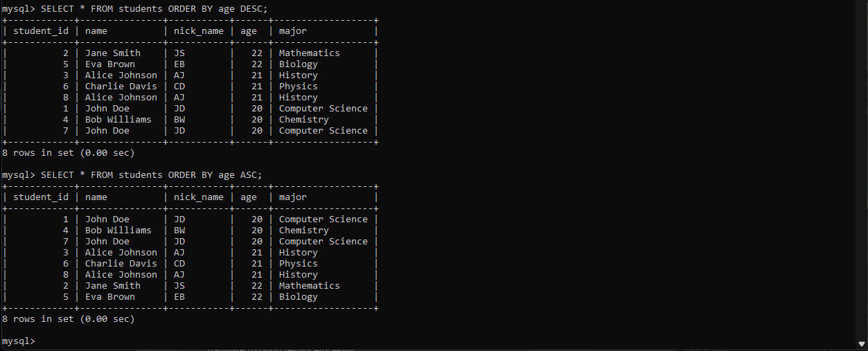 ASC နဲ့စီမယ်ဆိုရင်တော့ထုံးစံအတိုင်းပြောင်းပြန် ပြန်ဖြစ်သွားပြီးတော့ အငယ်ဆုံး student ကိုအရင်ပြမှာဖြစ်ပါတယ်။