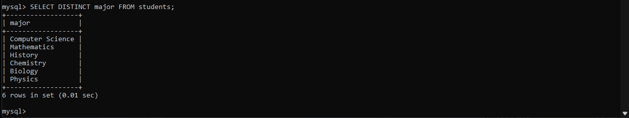 select ဆွဲတဲ့နေရာမှာ unique ဖြစ်တဲ့ record တွေပဲလိုချင်တဲ့အချိန်မှာ DISTINCT ဆိုတဲ့ keyword ကိုသုံးပါတယ်။ ဥပမာ students table ထဲက major နာမည်တွေလိုချင်တယ်၊ သို့ပေမယ့် ထပ်နေတဲ့ (duplicate) record တွေမပါချင်ဘူးဆိုတဲ့အခြေအနေမှာ DISTINCT ကိုသုံးနိုင်ပါတယ်