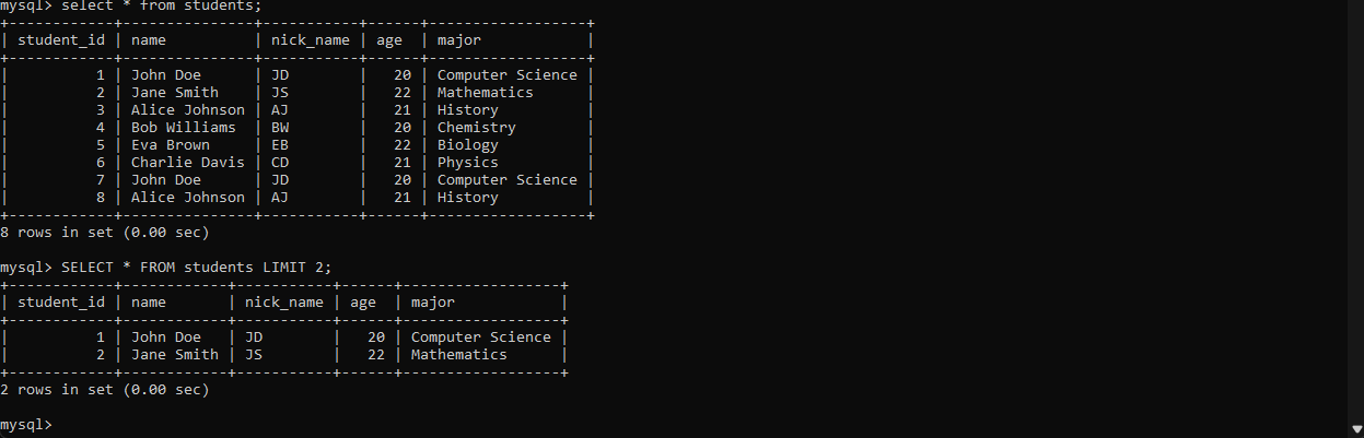 Table ထဲက records တွေအကုန်လုံးပါမလာချင်ဘူး၊ record ၂ခုပဲပါချင်တယ်၊ ၃ခုပဲပါချင်တယ်ဆိုတဲ့အခြေအနေမှာ LIMIT ခံပြီး select ဆွဲနိုင်ပါတယ်။