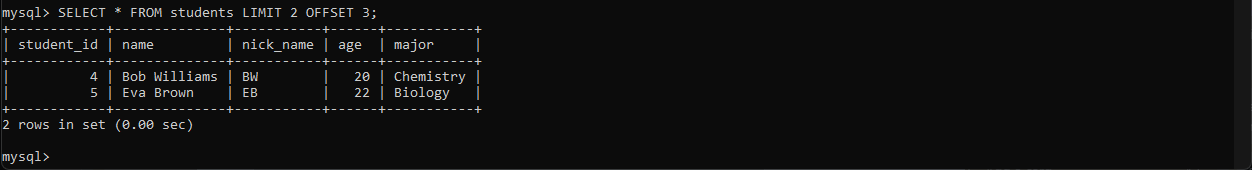 select ဆွဲတဲ့နေရာမှာ records တစ်ချို့ကိုကျော်ပြီးဆွဲချင်တယ် သို့ စမှတ်ကိုပြောင်းပြီးသတ်မှတ်ချင်တယ်ဆိုရင် OFFSET ကိုသုံးနိုင်ပါတယ်။ query နဲ့ screenshot ကိုတွဲပြီးကြည့်မယ်ဆိုပိုသဘောပေါက်လွယ်ပါမယ်။ Records ၃ခုကိုကျော်ပြီး LIMIT ကို 2လို့ခံပြီးဆွဲမယ်ဆို result အဖြစ် 4 ကစမယ်၊ LIMIT 2 ဖြစ်တဲ့အတွက် 2 rows ပဲထုတ်သွားမှာဖြစ်ပါတယ်။