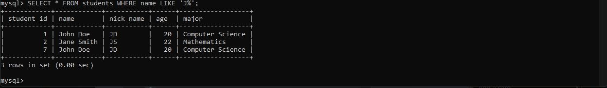 LIKE ကိုလည်းအရှေ့မှာတစ်ခေါက်ပြောထားပြီးသားဖြစ်ပါတယ်။ search လုပ်မယ့်နေရာမှာသုံးပါတယ်။ နာမည်မှာ J နဲ့ စတဲ့ကျောင်းသားတွေကိုဆွဲထုတ်ကြည့်ချင်တယ်ဆိုပါစို့။