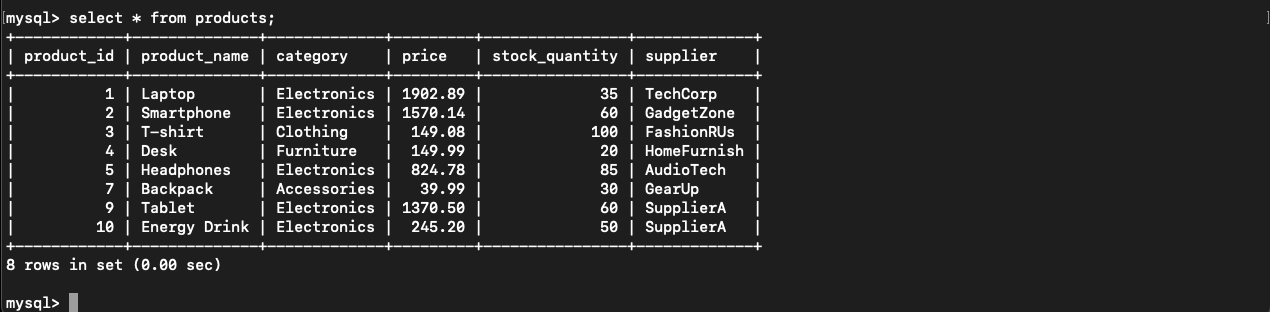products table ထဲကို data တစ်ကြောင်းသွင်းပါမယ်။ ရလဒ်ကိုအောက်ပါအတိုင်းကြည့်နိုင်ပါတယ်။