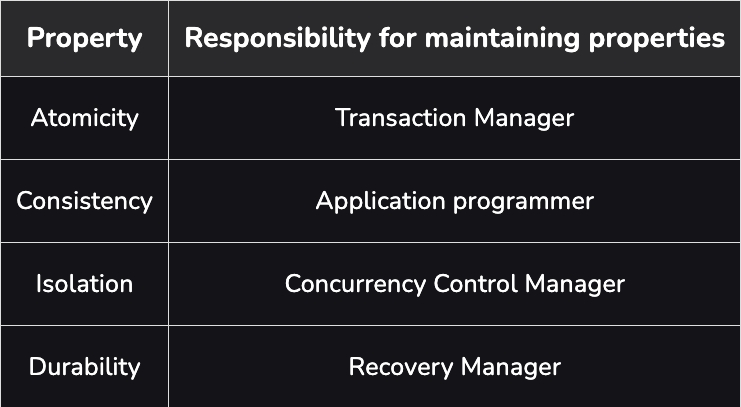 ACID properties ကိုအတိုချုပ်ရေးထားပေမယ့်အသေးစိတ်ကို ဒီမှာဝင်ဖတ်ကြည့်လို့ရပါတယ်။ https://www.geeksforgeeks.org/acid-properties-in-dbms/