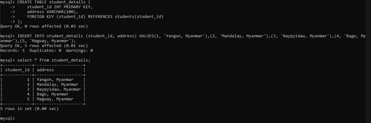 );တစ်ခါတည်း student_id ကို students table ရဲ့ foreign key အဖြစ်သတ်မှတ်ထားလိုက်ပါတယ်။