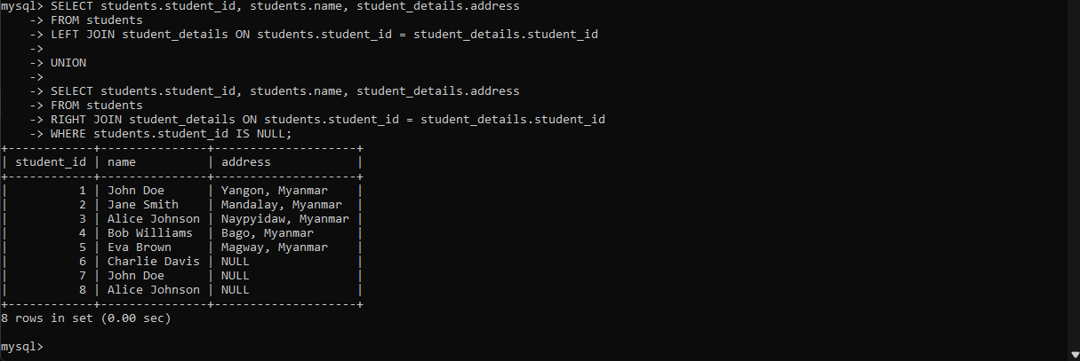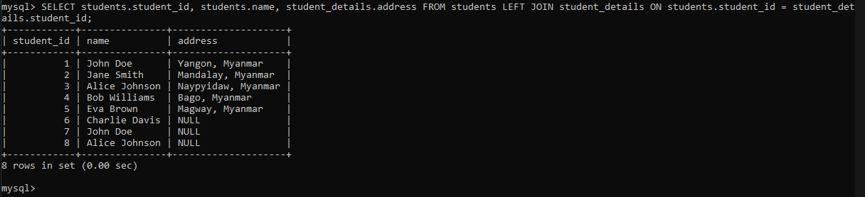 ဒီ query မှာဆို LEFT JOIN သုံးထားပြီးတော့ Left side table က stuents ဖြစ်မယ်။ Right side table က student_details ဖြစ်မယ်။ student_details table မှာမရှိတဲ့ students table က records တွေက address column မှာ NULL value တွေဖြစ်နေမှာဖြစ်ပါတယ်။ အောက်ကပုံနဲ့တွဲကြည့်ရင်ပိုနားလည်ပါလိမ့်မယ်။
