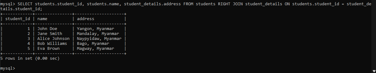 student_details မှာက student_id 1 to 5 အထိသာရှိတဲ့အတွက် table နှစ်ခုလုံးမှာ match ဖြစ်တဲ့ condition ဟာ student_id 1 to 5 ဖြစ်တဲ့ records ငါးကြောင်းသာဖြစ်ပါတယ်။ studentstable မှာရှိတဲ့ student_id 6,7,8 ဟာ student_details ထဲမှာမရှိတဲ့အတွက်ပါလာမှာမဟုတ်ပါဘူး။