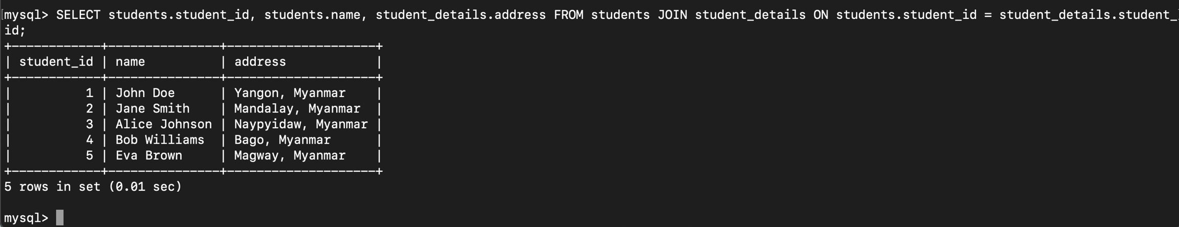 students table ထဲမှာရှိတဲ့ records တွေကိုသက်ဆိုင်ရာ student_details records တွေနဲ့အတူ JOIN လုပ်ပြီးဆွဲထုတ်ကြည့်ပါမယ်