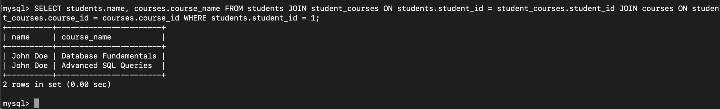 student_id 1 ဖြစ်တဲ့ကျောင်းသားကဘယ်လို courses တွေယူထားလဲဆိုတာဆွဲကြည့်ရအောင်။ Many to many relation ဖြစ်တဲ့ဒီနေရာမှာ junction table တစ်ခုခံထားတဲ့အတွက် JOIN ကနှစ်ခါဖြစ်သွားတာကိုသတိချပ်ထားရပါမယ်။