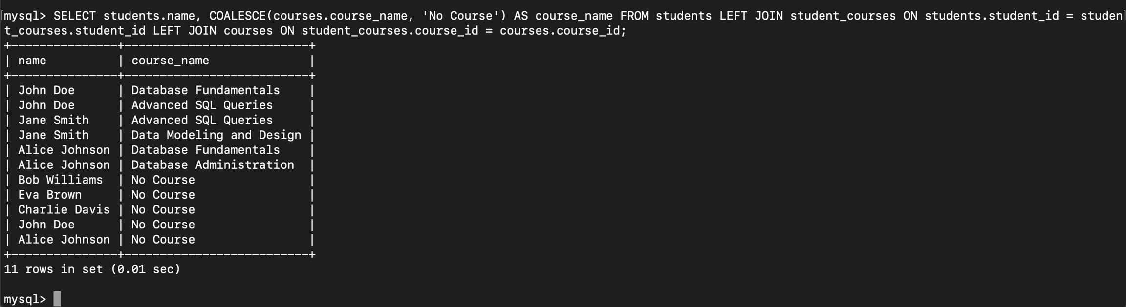 students ရော courses တွေရောအားလုံးကိုဆွဲထုတ်ကြည့်ပါမယ်။ courses တွေတက်ရောက်ထားခြင်းမရှိတဲ့ကျောင်းသားတွေတော့ COALESCE ဆိုတဲ့ function ကိုသုံးပြီးတော့ course_name နေရာမှာ No Courseဆိုတဲ့စာသားတစ်ခုအစားထိုးထည့်ပေးလိုက်ပါမယ်။