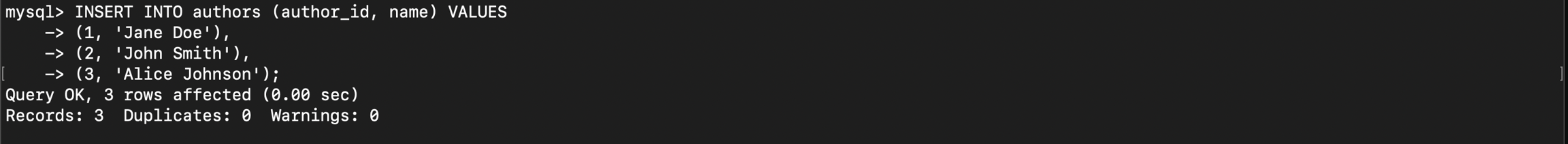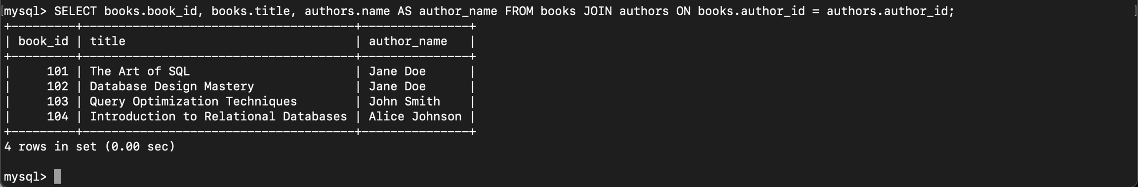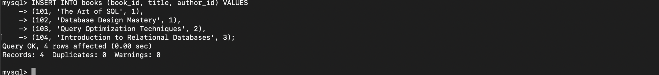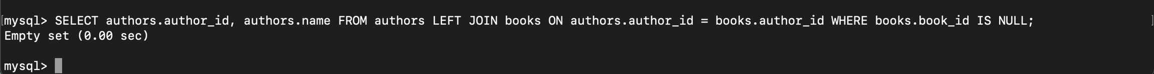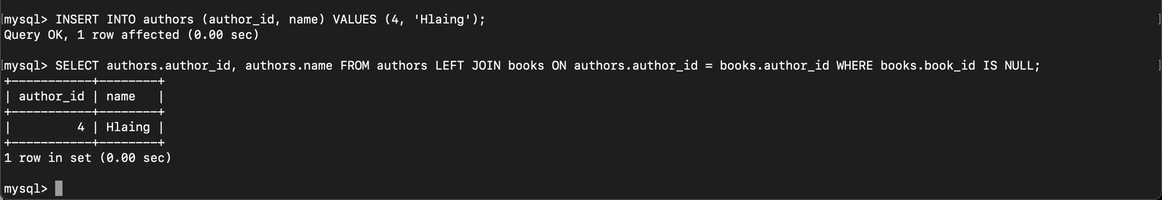 လောလောဆယ်သွင်းထားတဲ့ data အရ စာအုပ်မရေးထားတဲ့ author record မရှိတဲ့အတွက်ကြောင့် author record အသစ်တစ်ကြောင်းထည့်ကြည့်ပြီး query ကိုပြန် run ကြည့်ပါမယ်။
